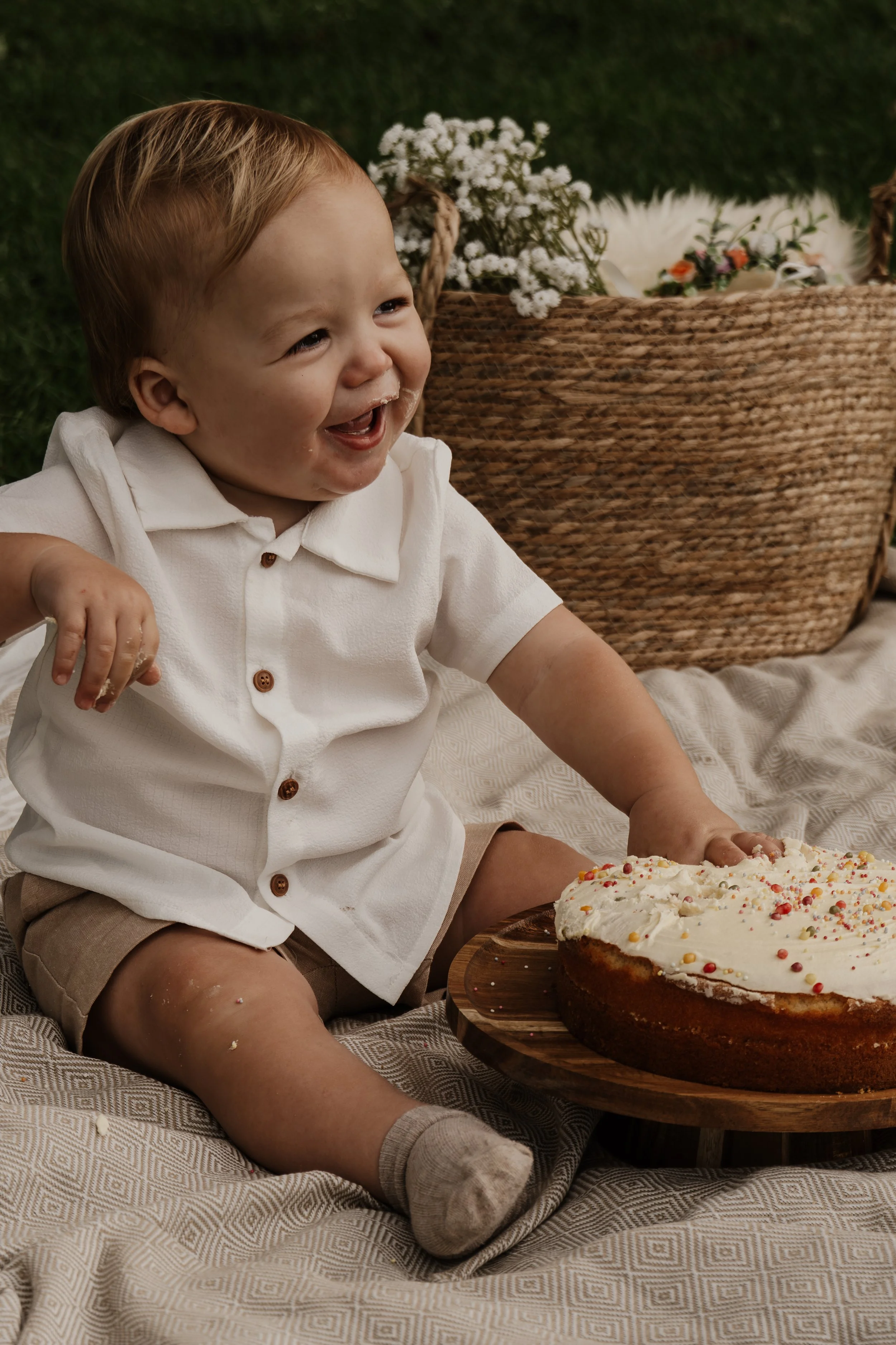 We started with the cousins running wild through the grass — lots of giggles, chasing, and those perfectly unplanned moments you can never recreate. Then came the main event: two cake smashes. It didn’t take long before icing-covered hands, crumbs everywhere, and the kind of expressions that make you laugh just looking at them.